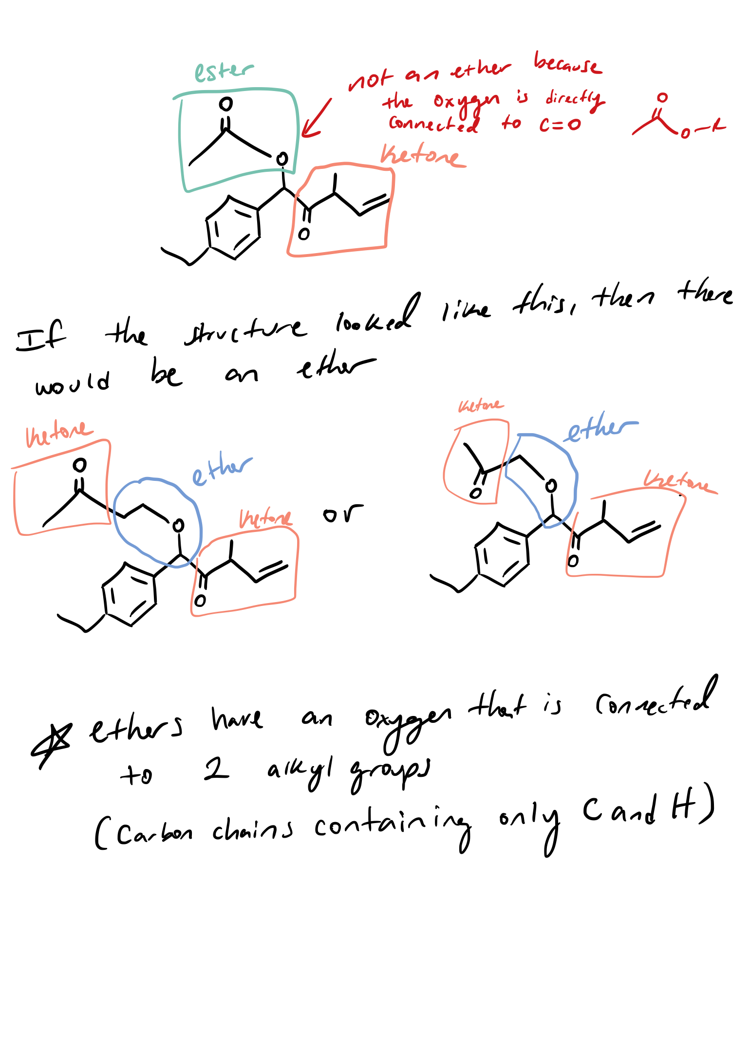There's no ether because that Oxygen is directly connected to the C=O (carbonyl group) which makes it an ester. For there to be an ether, the Oxygen would have to connected to 2 carbon chains that do not have any C=O. Attached you'll find examples of what an ether would look like if it were in the structure of practice problem 1.