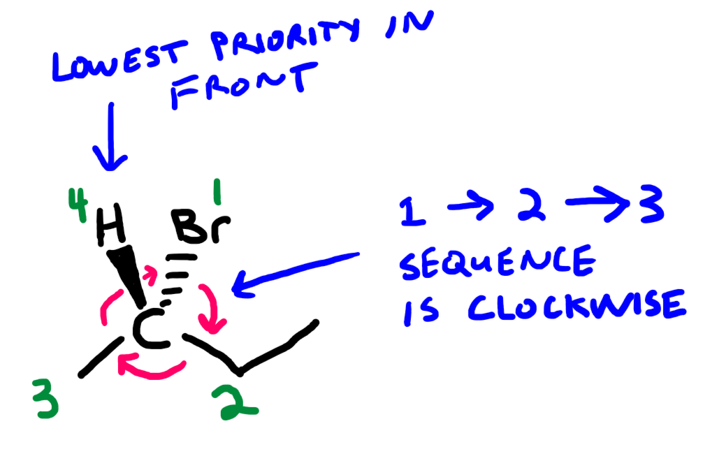 Between the ethyl group and the methyl group, the ethyl group takes priority. In this case, both atoms bonded to the chiral center are carbon, but we keep moving down the chain of atoms until a difference is found.  So the ethyl group is priority 2, and the methyl group is priority 3.