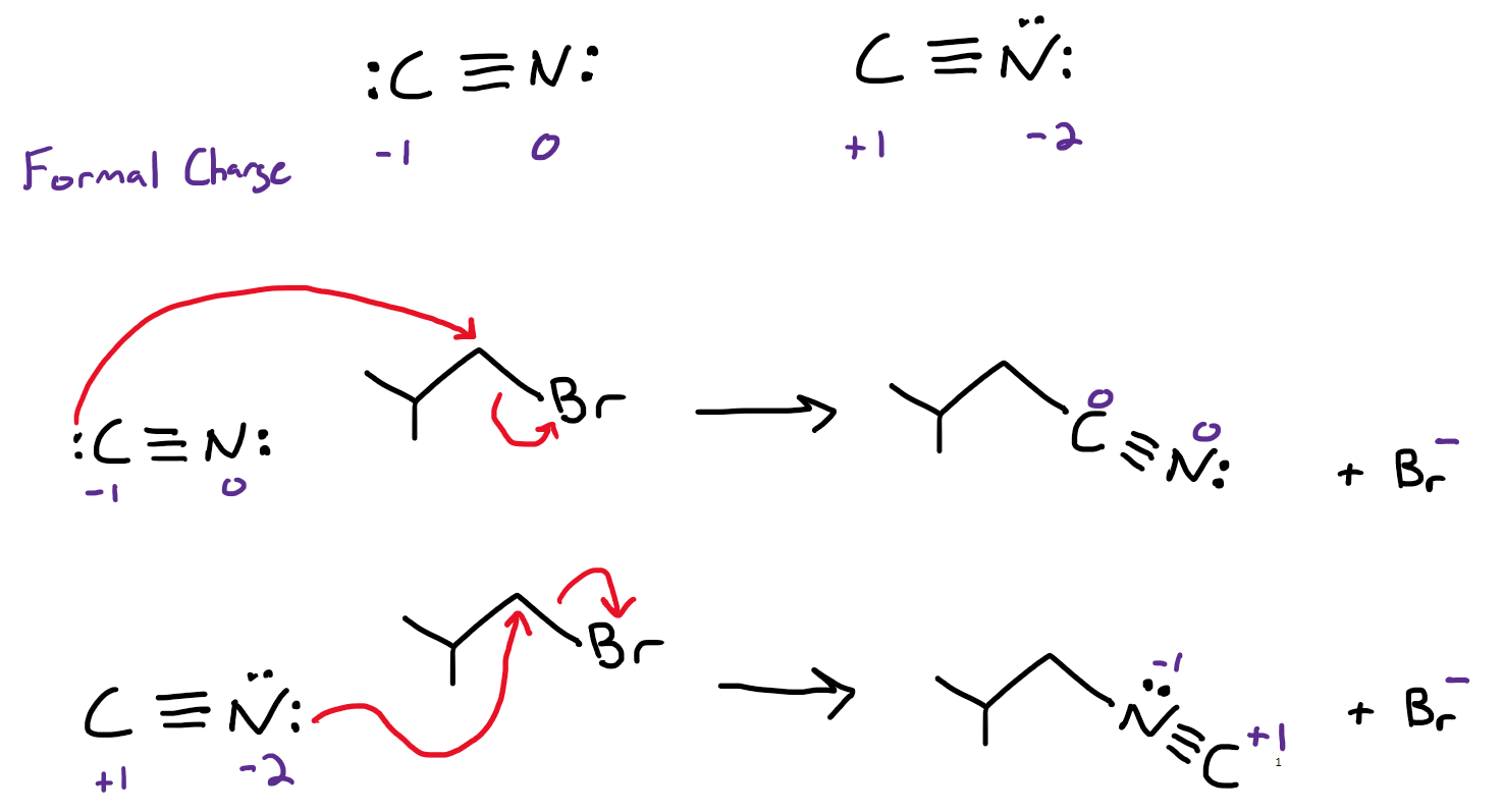 If we imagine the nucleophilic attack taking place from the nitrogen atom, we'll see a similar story in the product--we get non-zero formal charges for both the carbon and the nitrogen.