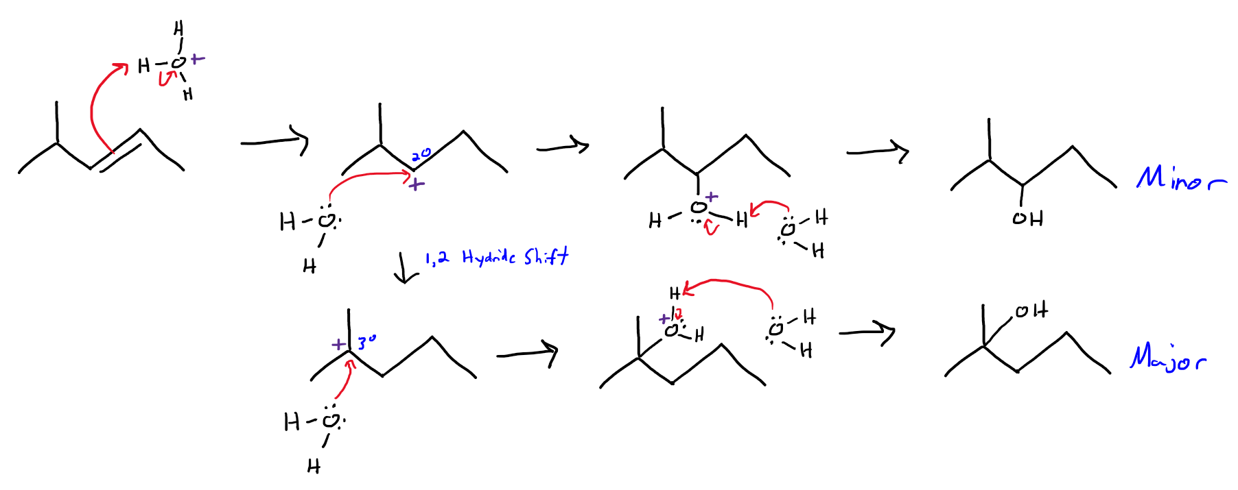 The reaction shown is an acid-catalyzed hydration of an unsymmetrical alkene. The secondary carbocation formed upon protonation of the double bond can undergo a 1,2 hydride shift to form a more stable tertiary carbocation.  However, the intermediate is not exclusively the tertiary carbocation.