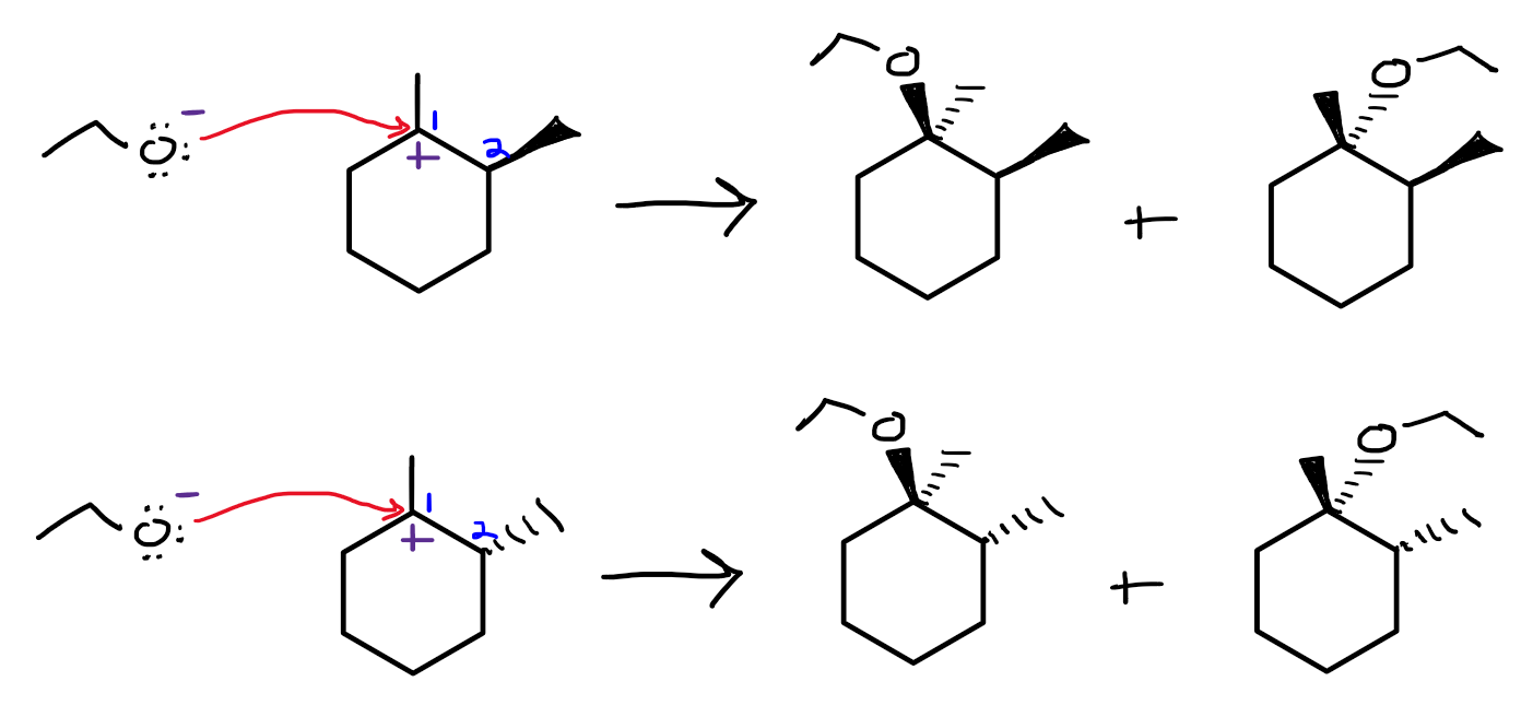 The carbocation intermediate is planar, so the nucleophile can attack from either side, giving two enantiomers from each carbocation.  So in total, we have four stereoismers.