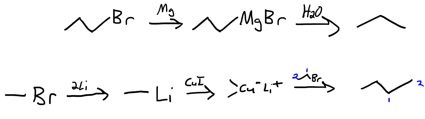 The second reaction of the top row is incorrect.  Grignard reagents do not react with alkyl halides via SN2 to form alkanes.  If we wanted to prepare propane from an alkyl halide, we would start with propyl bromide, treat it with magnesium to form propylmagnesium bromide, then treat it with a weak acid like water, an alcohol, or a carboxylic acid to protonate it (see image).
