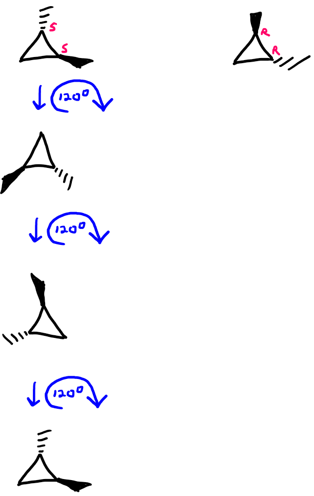 For this one, we can turn the molecule sideways, keeping track of where are substituents are to convert to a structure that uses wedged and dashed lines. This way, we can see the atoms a little bit better.