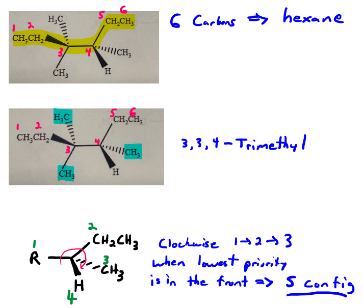 Carbon 4 is a chiral center. Cahn-Ingold-Prelog priorities are as follows: carbon 3 is priority 1, the ethyl group is priority 2, the methyl group is priority 3, and the hydrogen is priority 4. With the lowest priority group in the back, the 1 > 2 > 3 sequence follows the counterclockwise direction, so carbon 4 has the S configuration.