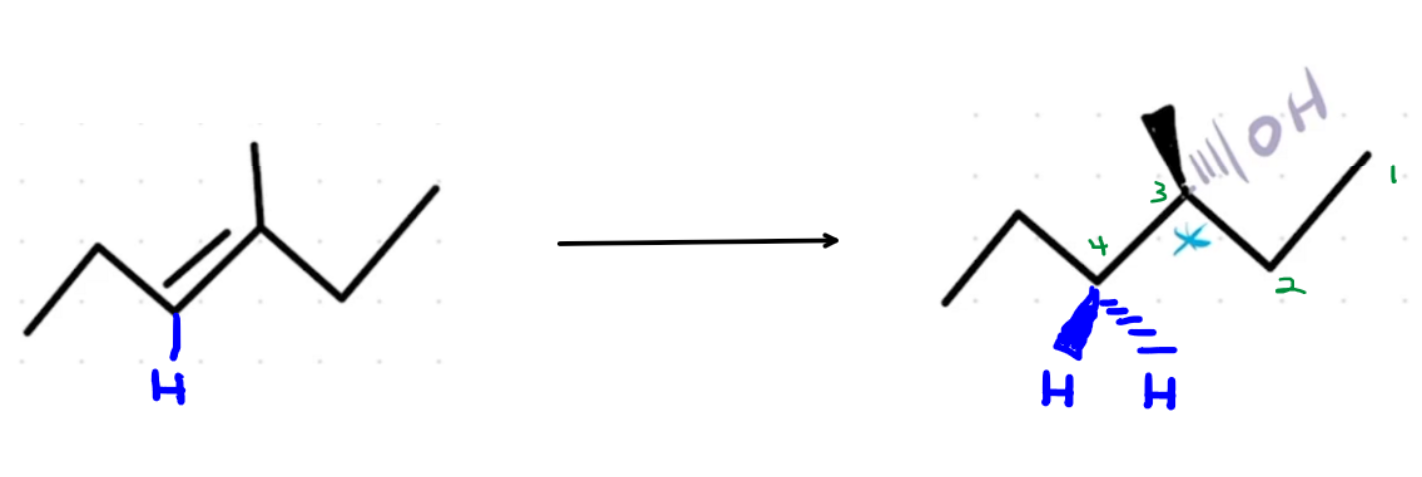 Carbon 4, where the hydrogen is added, already had a hydrogen before the reaction. When the product forms, Carbon 4 is bonded to two hydrogens and two carbons. Since it doesn't have four unique groups bonded to it, it's not a chiral center, so we don't need to use wedged and dashed lines to show stereochemistry.